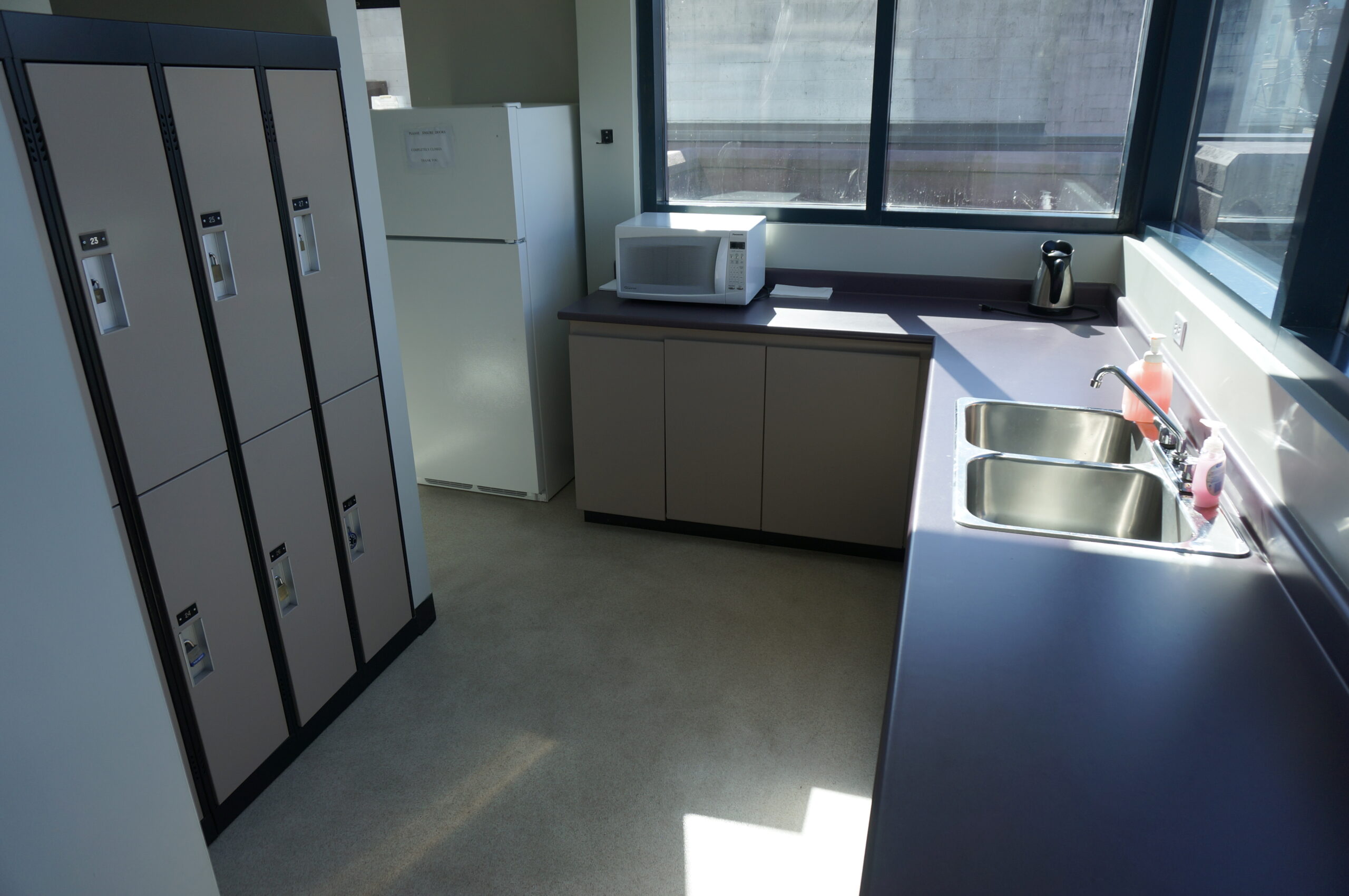 Shared kitchen, terrace, shower, and lockers